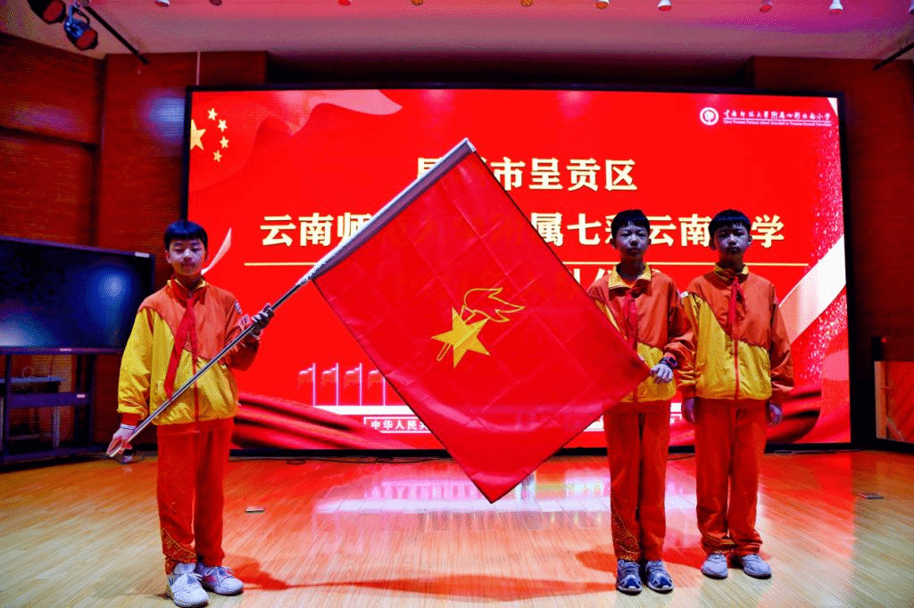 云南师范大学附属七彩云南小学新队员们在队旗下庄严宣誓、呼号,表达出他们的心声——“为共产主义事业而奋斗,时刻准备着!”