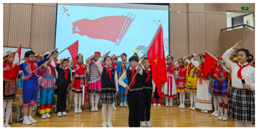 云南师范大学附属昆明湖小学举行“红领巾心向党”队日活动。全体少先队员敬队礼,高唱《中国少年先锋队队歌》,嘹亮的歌声表达了学生对少年先锋队的忠诚与热爱。