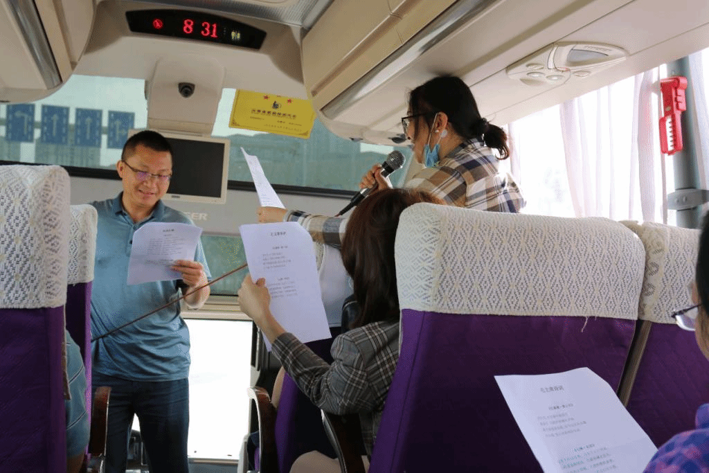 参加本次主题教育实践活动的全体老师,在前往“柯渡”的大巴车上集体朗诵了诗词《忆秦娥 娄山关》《七律 长征》,并放声齐唱经典红歌《没有共产党就没有新中国》《团结就是力量》《黄河大合唱》《东方红》,回顾了红军长征所战胜的艰难险阻和诗中满怀的战斗豪情,表达了对党的热爱与忠诚。