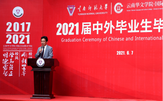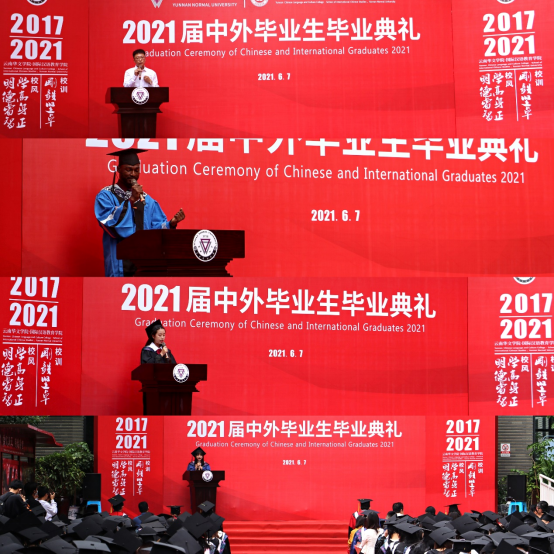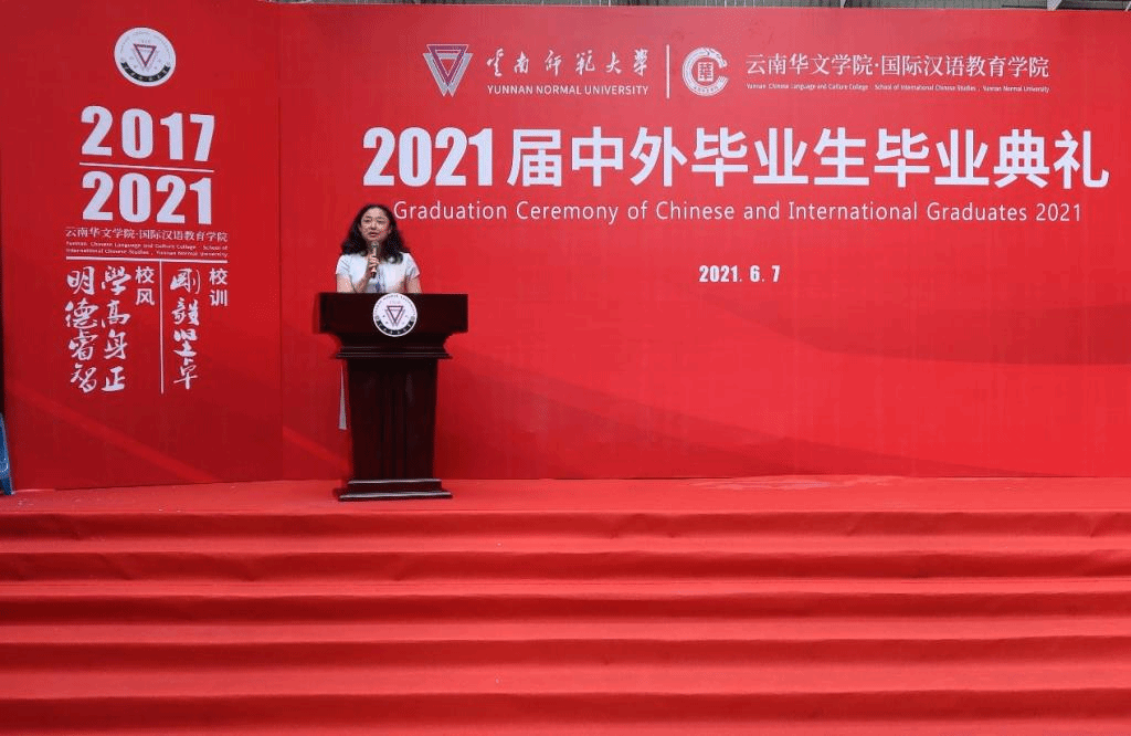 6月7日上午,云南华文学院、国际汉语教育学院在同析2栋正门广场举行了2021届中外毕业生毕业典礼,全体院领导、学院学位评定委员会委员、系主任、辅导员、2021届中外毕业班班主任及全体中外本硕毕业生参加了毕业典礼。典礼由学院党委副书记常数主持,同时,通过腾讯会议、钉钉等平台向国外全体留学生毕业生直播典礼。