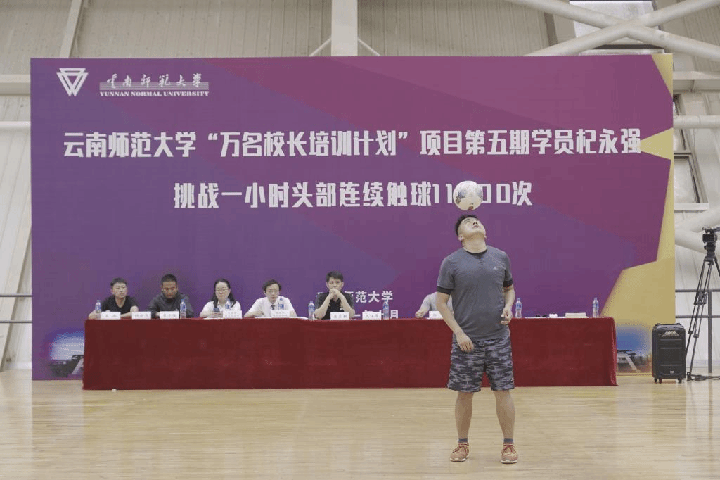 足球不仅仅是一项体育运动,也是一种文化精神。为进一步弘扬顽强拼搏的体育精神,丰富校园文体生活,促进学员全面发展,7月6日下午,“万名校长培训计划”项目第五期学员杞永强挑战一小时头部连续触球11000次活动在呈贡主校区东区体育馆二楼进行。挑战活动由本期学员云南师范大学附属小学团委书记冯镜宇主持,挑战活动全程在云南省昆明市国正公证人员的公证下进行。