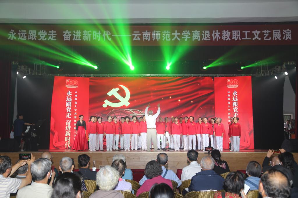 2021年7月8日下午,一场由离退休教职工自编、自导的“永远跟党走 奋进新时代” 离退休教职工文艺展演在一二一西南联大校区离退休教职工西院活动中心举行。校党委副书记张玮,离退休老领导,离退休工作领导小组成员单位负责人,一二一西南联大校区各单位负责人,获得中共中央“光荣在党50年”纪念章的党员代表、受表彰的“两优一先”代表、“庆祝中国共产党成立100周年”文艺作品获奖者,各党总支、党支部支委以上干部、各团体协会负责人、教工住宅区行政组长、活动室管理员以及演出人员共250余人参加了展演活动。展演活动由退休教师周林和何巧玲主持。