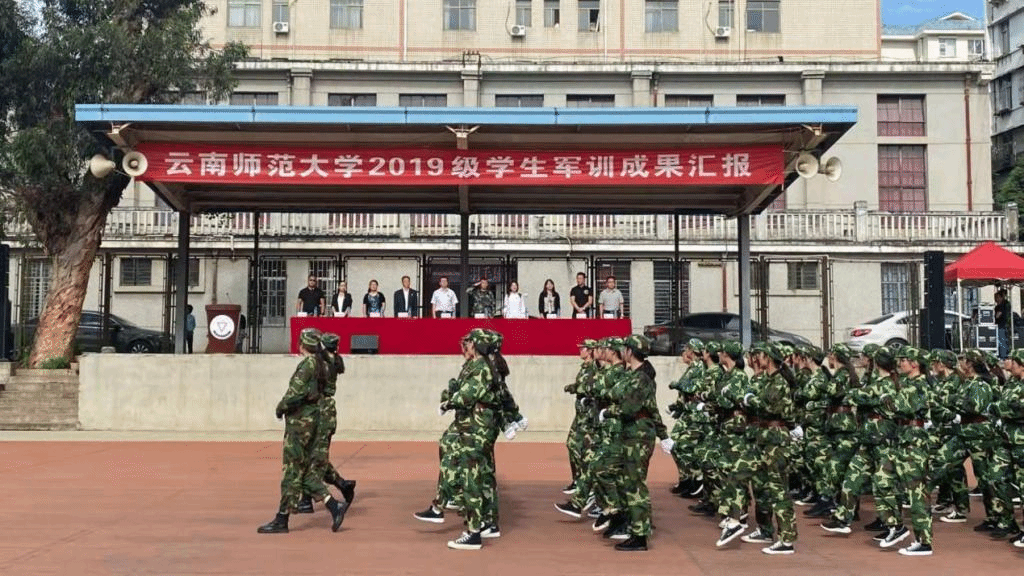 7月18日上午,云南师范大学2019级学生军训成果汇报在呈贡主校区西区田径场和一二一西南联大校区田径场同时举行。学校党委副书记李宏、副校长牛治亮、副校长蔡金红,武警云南总队机动第一支队上校支队长张定乾、中校副支队长许韬、中校副政治委员张彦、中校政治教导员冯俊辉、宣传保卫股股长马李恒、90名承训部队教官、学校军训工作领导小组、各学院党委副书记、带训教师以及2019级全体参训学生参加了军训成果汇报。