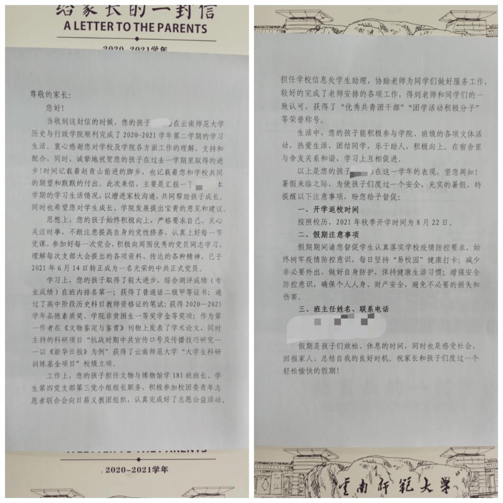 学院15位班主任老师亲自为945名学生一一撰写信件,向家长详细报告了学生2020-2021学年在思想、学习、生活上的表现,既告知家长孩子们在校的获奖及表彰情况,也指出孩子们还需进步的地方,同时主动了解学生家庭基本情况、暑期生活学习情况,就疫情防控常态化提出相关要求,并听取家长对学院发展和学生工作的意见和建议。学院为每封信件精心设计了信封统一寄出。同时,学院也为2021级新生设计制作了“致2021级新生及家长们的一封信”,将随录取通知书一并寄给新生。一封封温馨的信笺,一句句真挚的问候即将通过“绿色信鸽”飞向每一个学生父母。相信来自学院和班主任充满真诚和爱意的信件,会拉近学生、家长、老师之间的距离,让交流变得更有温度,形成学院老师与家长良好的沟通渠道。