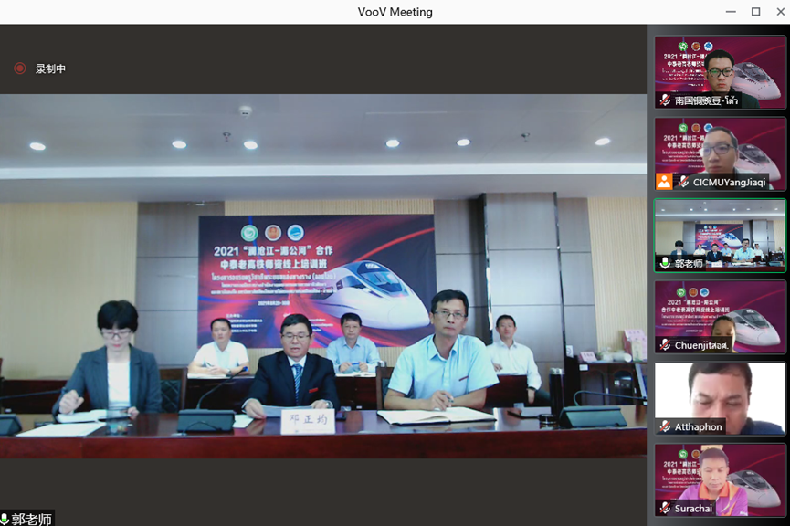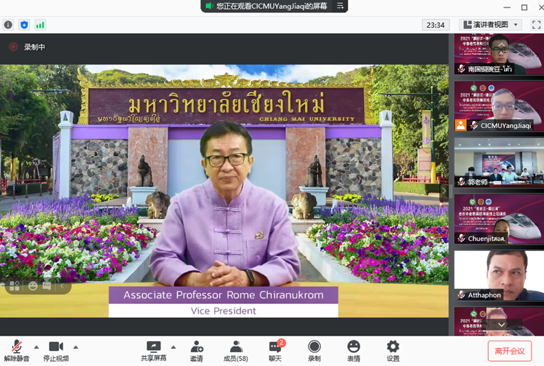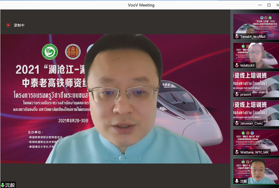 2021年8月28日,由我校承办的清迈大学孔子学院协同泰国教育部职业教育委员会、昆明铁道职业技术学院成功举办2021“澜沧江-湄公河合作中泰老高铁师资培训班”线上开班仪式。泰国教育部职业教育委员会阿塔鹏·桑夸世副秘书长、老挝体育教育部职业教育司赛康·潘塔文副司长、清迈大学龙姆副校长、云南师范大学刘宗立副校长、昆明铁道职业技术学院邓世均副校长、清迈大学孔子学院中泰方院长和授课教师及全体参训学员参加了线上开班仪式,会议由清迈大学孔子学院院长助理窦体乾老师主持。
