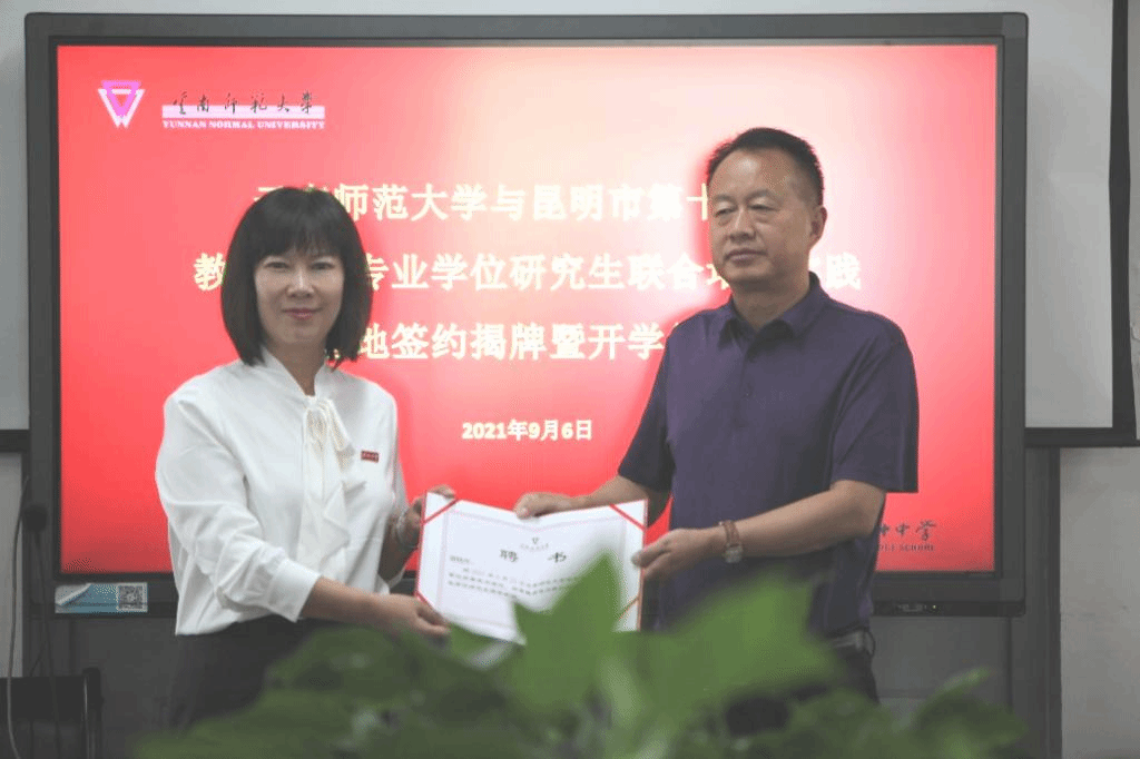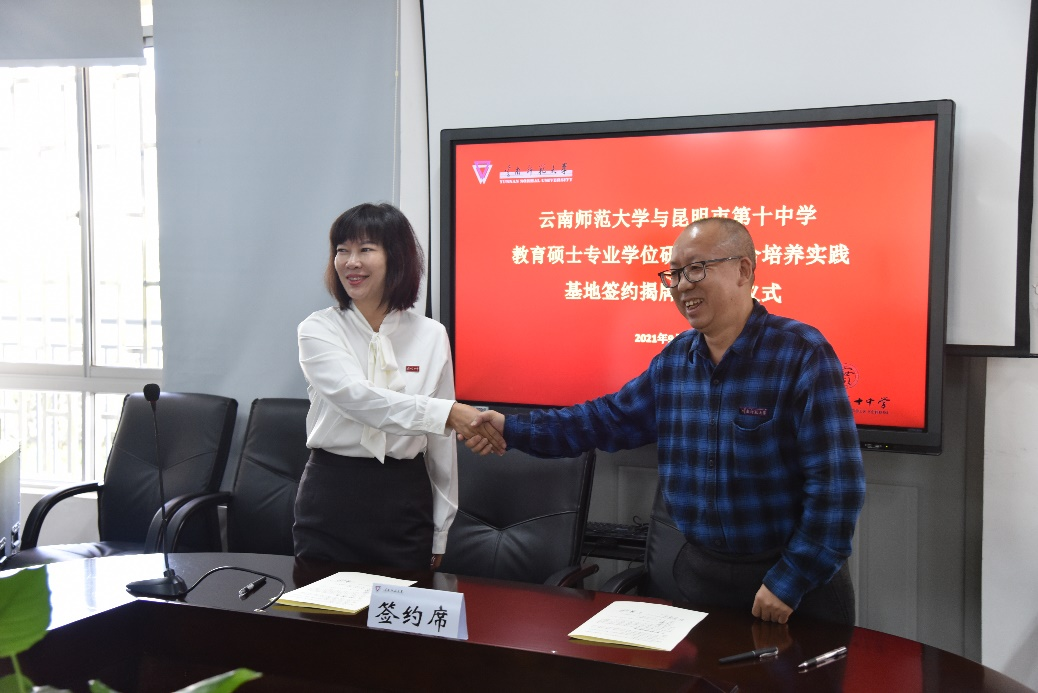 随后,研究生院骆华松院长和昆十中谢晓玲校长共同签署了《共建教育硕士专业学位研究生联合培养实践基地协议》。研究生院罗利佳副院长宣读昆明市第十中学谢晓玲等27名教师遴选为云南师范大学校外教育硕士专业学位研究生指导教师的决议,安学斌副校长为新遴选的导师代表颁发了聘书。