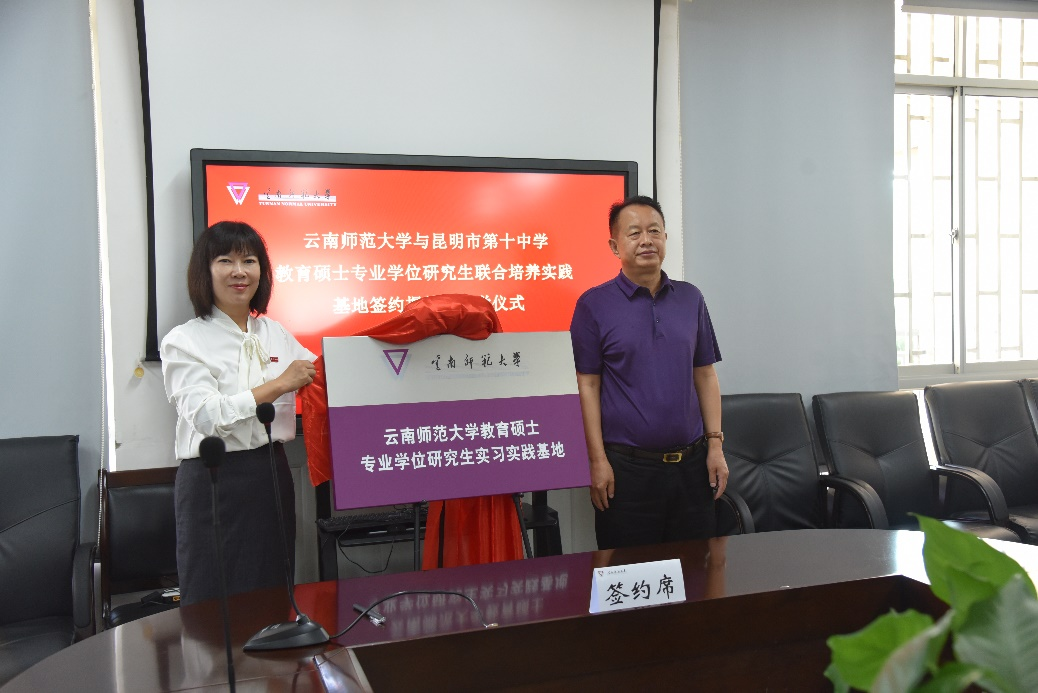 9月6日,云南师范大学与昆明市第十中学教育硕士专业学位研究生联合培养实践基地签约揭牌暨开学仪式在昆明市第十中学顺利举行。我校副校长安学斌,研究生院院长骆华松、副院长罗利佳,各相关学院主管领导、带队指导教师、教育硕士实习生;昆明市第十中学校长谢晓玲、副校长袁刚、副校长杨文波以及德育处、教务处、教学拓展中心、科教中心负责人出席仪式。仪式由研究生院骆华松院长主持。