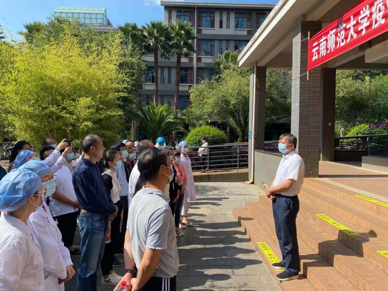 为进一步规范新冠肺炎疫情防控工作,检验疫情突发后防控应急预案的可操作性,增强各部门之间的协同配合,有效保障师生员工的生命安全和身体健康。 9月10日下午,在学校防控办的统筹协调下,我校在呈贡校区开展应对新冠肺炎疫情防控应急处置演练。校党委副书记李宏,呈贡区疾病预防控制中心主任孙继福现场观摩指导,防控办、学生处、保卫处、后勤保障服务中心、心理中心、校医院、经济与管理学院师生参加演练。