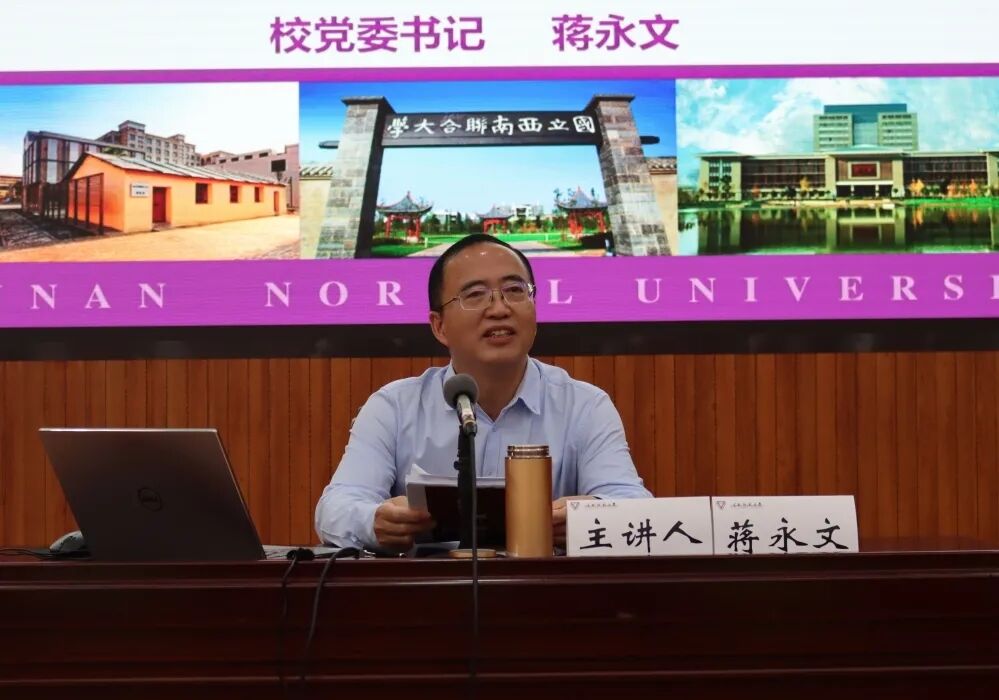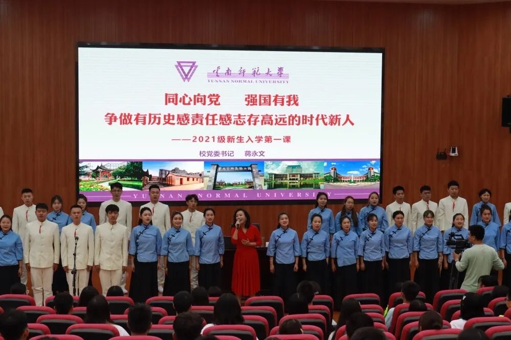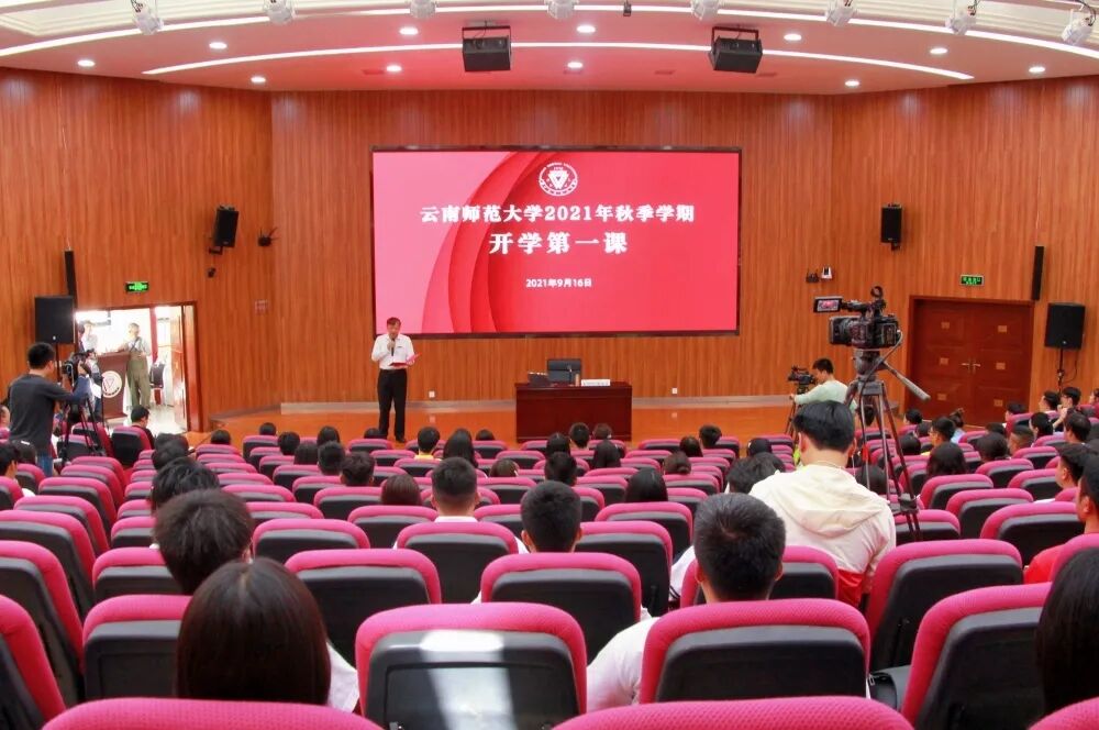 为贯彻落实省委教育工委、省教育厅“书记、校长同讲一堂思政课”教学要求,帮助2021级新生尽快融入大学学习生活,顺利完成角色转换,扣好“人生的第一粒扣子”,9月16日下午,我校党委书记蒋永文以《同心向党 强国有我 争做有历史感责任感志存高远的时代新人》为题,为全体2021级新生讲授开学“第一课”。9800余名师生在我校呈贡校区汇学楼报告厅和96个分会场同上开学“第一课”。