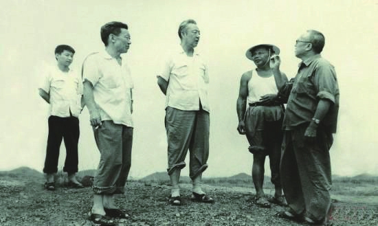 1978年8月,习仲勋(左三)在广东惠阳农村调研。在清华大学学习的习近平(左一)利用暑假时间参加社会实践,随同父亲一起下乡