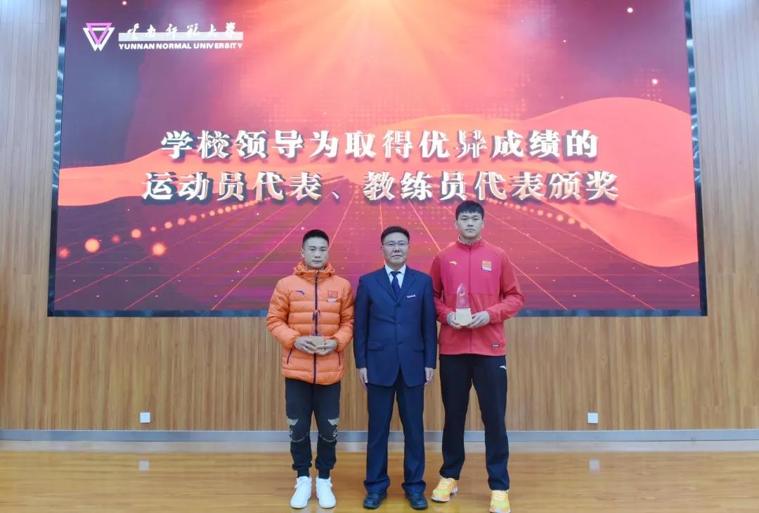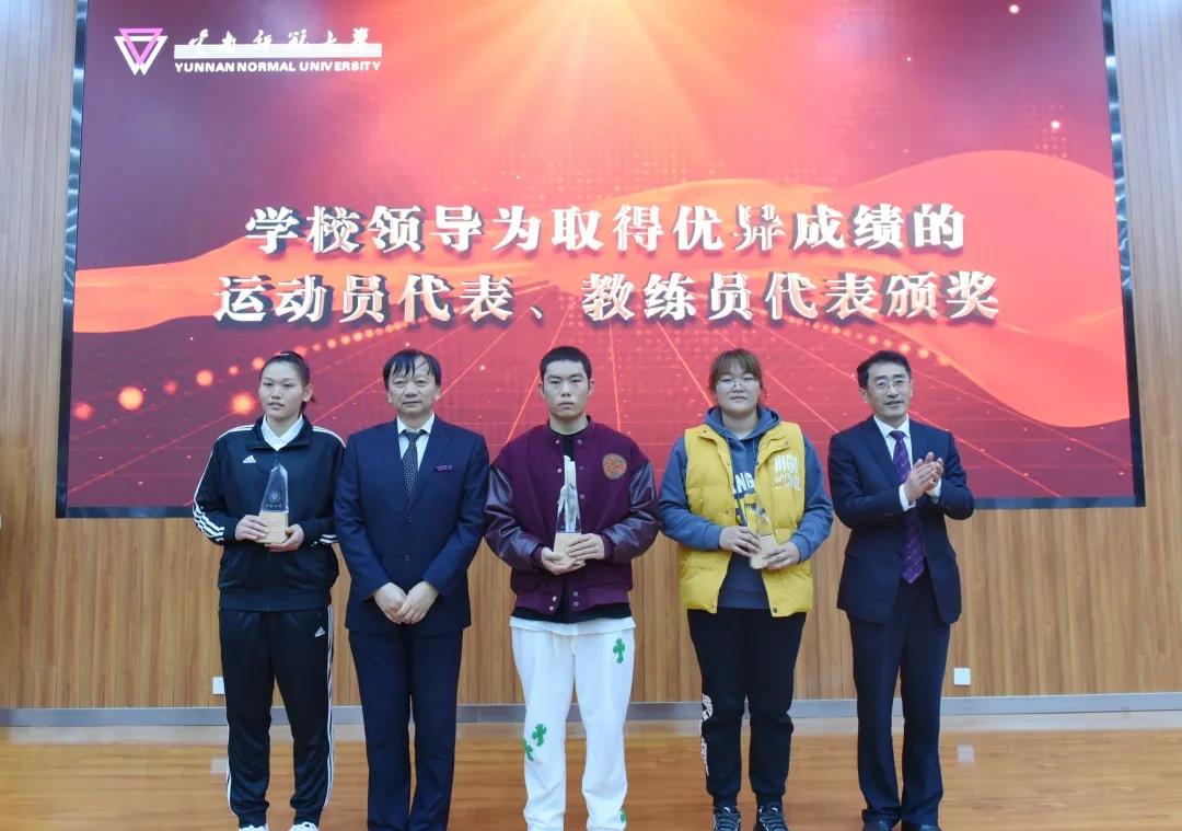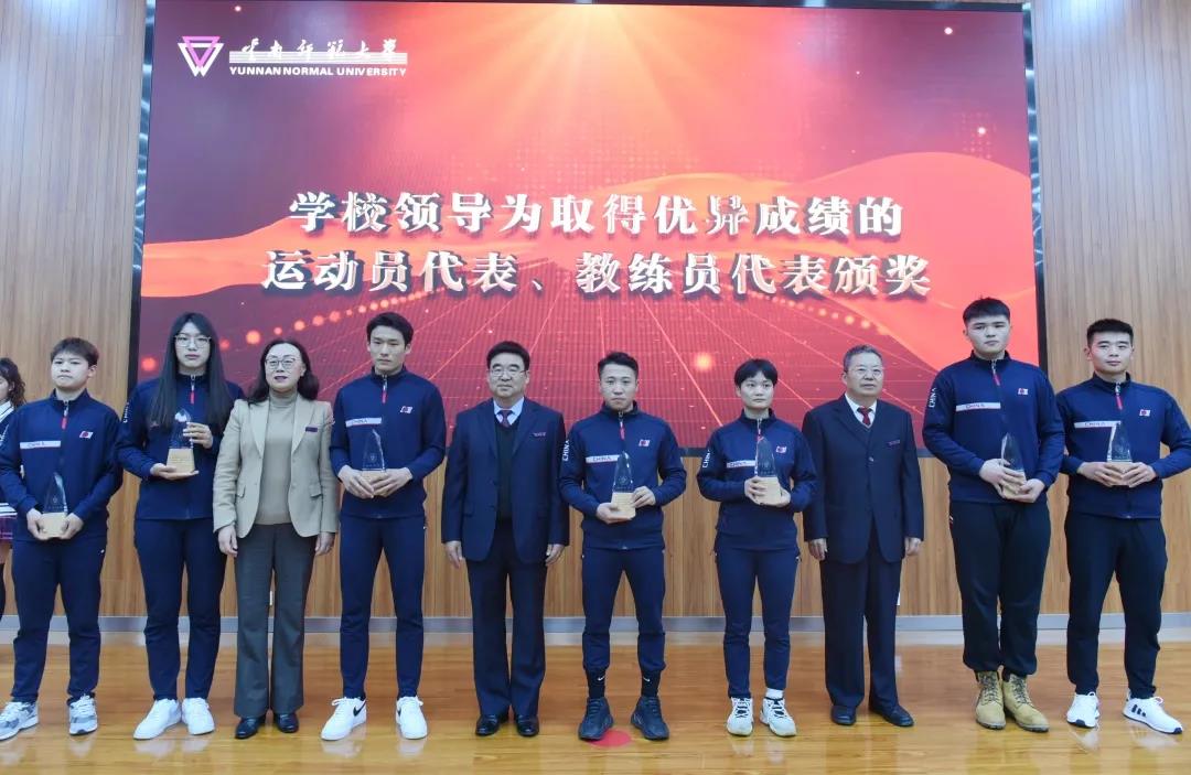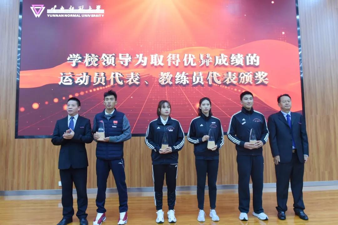 校长王德强致辞,代表学校向参加国际级、国家级体育运动竞赛取得优异成绩的各位运动健儿、教练员和体育工作者表示热烈的祝贺和崇高的敬意。王德强校长指出,党的十八大以来,学校认真贯彻落实习近平总书记关于教育、体育的重要论述和全国教育大会精神,牢记初心使命,不断加强体育教育,努力培养德智体美劳全面发展的社会主义建设者和接班人,为加快建设体育强国贡献力量。一是竞技体育实现重大突破。截至目前,我校运动健儿在奥运会、残奥会等国际级体育竞赛中荣获奖项38项、国家级比赛中荣获奖项293项、省级比赛中荣获奖项706项,我校代表团连续六届蝉联云南省大学生运动会金牌总数和团体总分第一名。二是体育教育事业蓬勃发展。学校紧紧围绕教师教育特色培养体育人才,荣获国家、省级教学成果奖,通过国家、省级一流课程认定,成为西南地区培养基础体育教师、高层次体育科研人才、运动训练人才、体育管理人才和国家级社会体育指导员的重要基地,培养了各类体育专门人才2万余名,赢得了社会广泛赞誉。三是全民健身水平不断提升。学校牢固树立“健康第一”的教育理念,扎实推进全民健身活动,加强校园体育文化建设,办好年度体育节、校级田径运动会,开展千人太极拳、千人啦啦操等活动,全民健身的氛围日益浓厚,“我运动、我健康、我快乐”的运动健康理念在校园蔚然成风。王校长衷心希望云南师大体育在新时代迸发出更加强劲的活力,祝愿中国体育谱写出更加光辉灿烂的篇章。