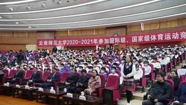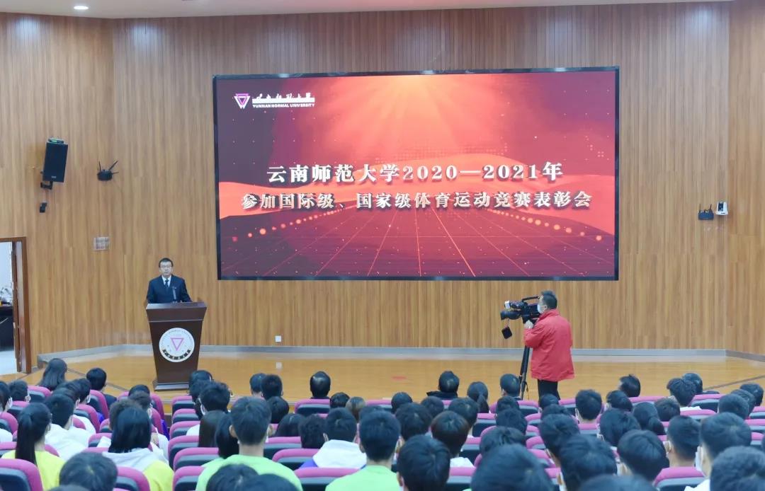 10月22日下午,在喜庆热烈的氛围中,云南师范大学2020-2021年度参加国际级、国家级体育运动竞赛表彰会在呈贡主校区汇学2幢报告厅举行。校领导、体育运动委员会委员单位主要负责人,全体受到表彰的运动员、教练员代表以及各学院师生代表参加了表彰会。会议由副校长牛治亮主持。