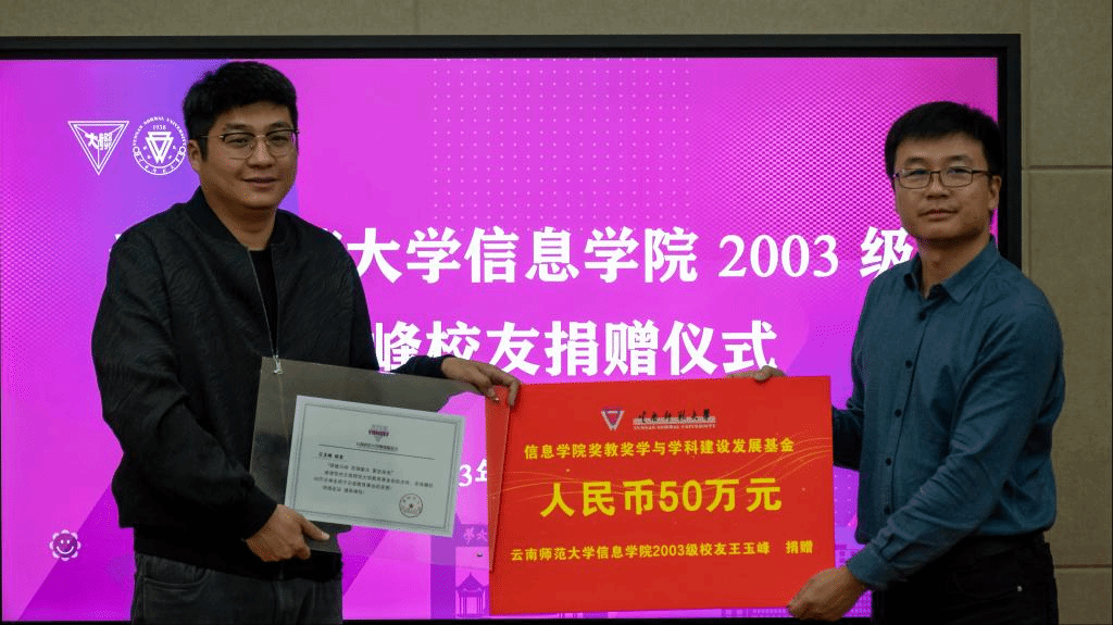 10月31日,在西南联大在昆建校暨云南师范大学建校85周年之际,云南师大信息学院2003级校友王玉峰捐赠仪式在呈贡校区举行。信息学院将设立“麦岚优秀学生干部奖学金”计划,以表彰和激励在学术和社会实践活动中表现出色的学生干部。