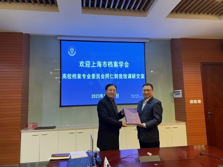 11月17日上午,上海市档案学会高校档案专业委员会汤涛(华东师大档案馆馆长)、黄岸青(复旦大学档案馆馆长)、曹灵钰(上海交大档案文博中心副主任)、卢志国(上海大学档案馆馆长)、俞玮琦(华东师大档案馆办公室主任)一行5人到我校档案馆、校史馆参观交流。