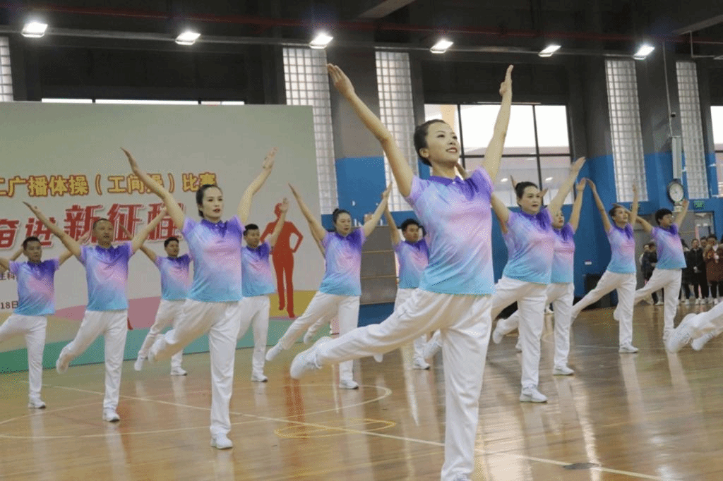 随着《第九套广播体操》的音乐响起,大家踏着轻松的节拍,伸展、转腰、踢腿、跳跃,每个动作都标准到位、刚健有力,展现出了较高的竞技水平的和昂扬的精神风貌。