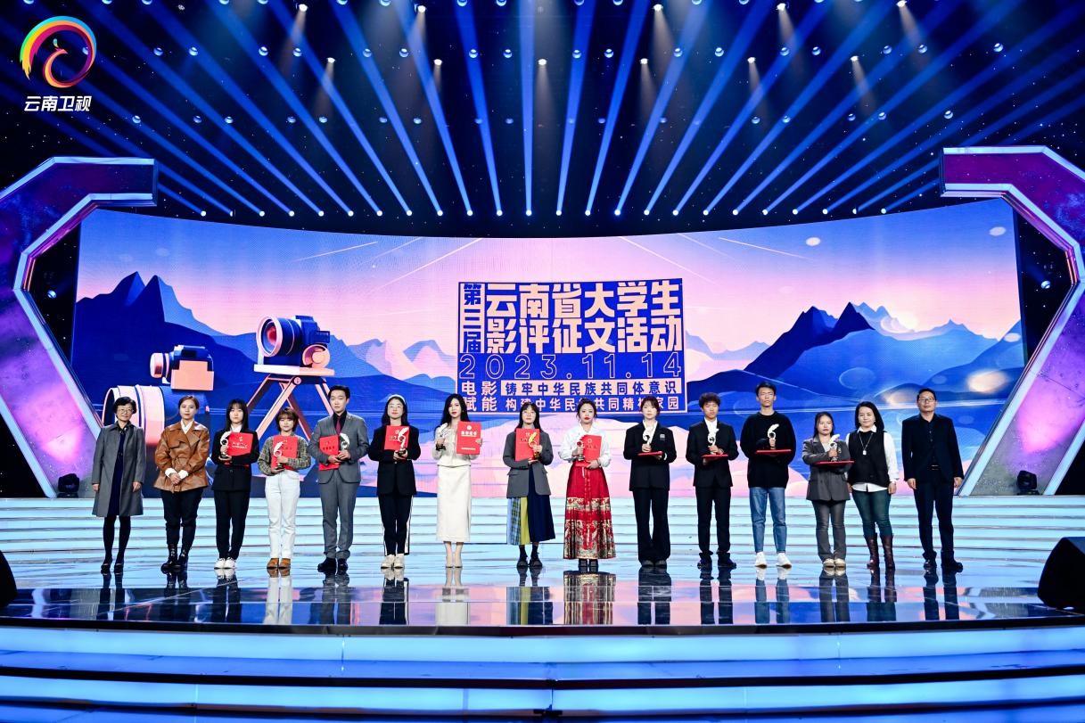 活动现场还进行了第三届云南省大学生影评征文颁奖。本次征文活动收到了85所院校投递的870篇作品,经评审委员会专家评审,我校传媒学院陈嘉雯、邱青青、周晓婷、王雨鑫4名同学获得本科生组优秀作品奖,张齐、谭辉、李淼3位老师获得优秀教师奖。