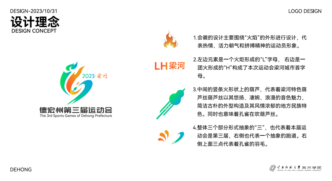 本届运动会会徽和吉祥物由我校美术学院谭玉琳老师和陶轩宇、肖杨、盛钰涵同学共同设计完成。会徽巧妙融合了葫芦丝、孔雀羽毛、火焰和跑道等元素,充分展示了德宏特色民族文化内涵,代表着热情、活力、拼搏的运动精神。