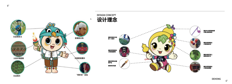 吉祥物整体形象结构简洁、活泼可爱、便于记忆和传播。“梁宝”发尖孔雀翎,尾巴孔雀尾,头戴景颇族头饰,身挂蚂蚱花挂坠,手持火炬。“葫宝”(“葫”谐音“福”)身着阿昌族民族服饰,头戴五彩绒球花,缠阿昌族绑腿。微笑的表情,友好而充满自信,体现对梁河这座城市的美好未来充满期待。张开的双臂是对五彩缤纷生活的向往,也是对来自五湖四海朋友的热情邀约和欢迎。