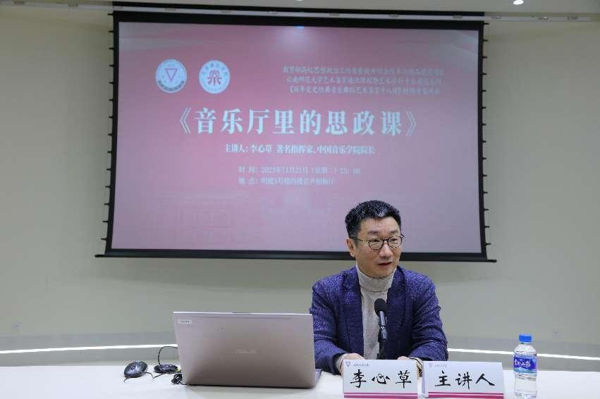 当天下午,李心草为音乐舞蹈学院师生进行了《音乐厅里的思政课》的专题讲座。他结合指挥的大型交响合唱《领航》在二度创作中的领唱和合唱三个版本的音乐、歌词的理解分析与体会,给师生们上了一堂生动的特色思政课。