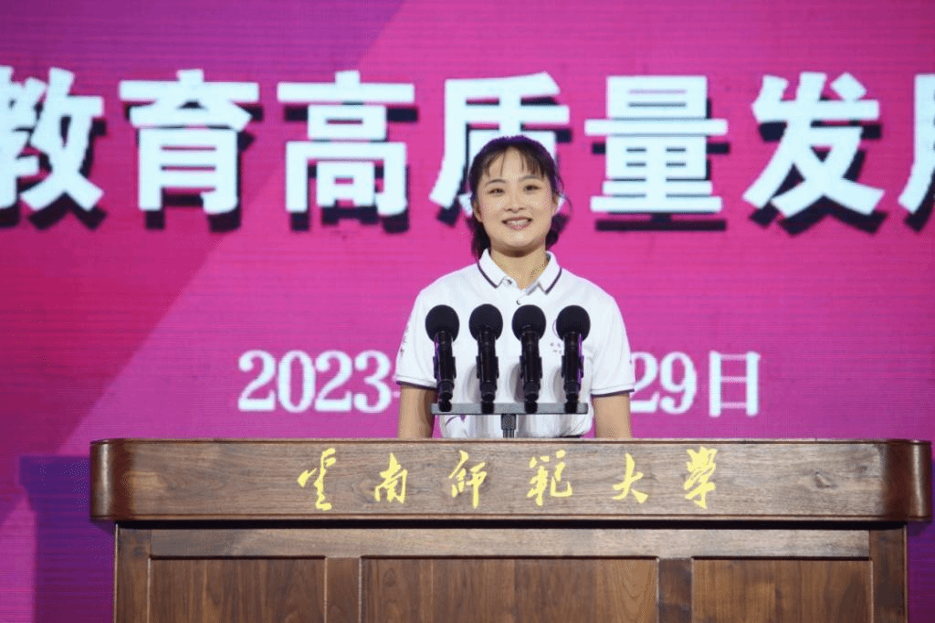 杨雅淇,我校传媒学院2023级研究生。本科期间,加入学校第八届研究生支教团,于2022年7月与团队一同前往地震灾区的昭通市鲁甸县龙头山镇龙泉中学支教,以自己的力量践行教育扶智的青春誓言。“校歌中的‘中兴业,须人杰’,既是历史的见证与呼唤,也是我们当代云师青年的使命与担当。接过时代的接力棒,我们准备好了。”她在代表校学生发言中激情表示。