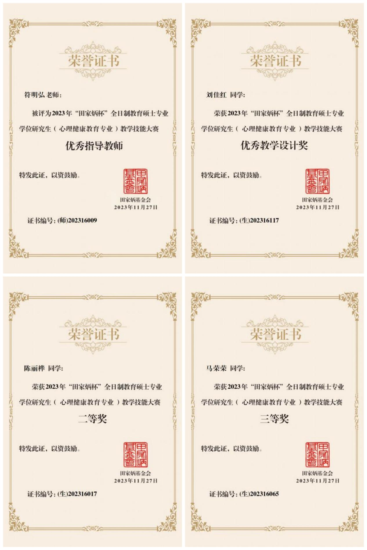 近日,2023年全国“田家炳杯”全日制教育硕士专业学位研究生“心理健康教育”专业教学技能大赛决赛在华南师范大学举行。经过激烈角逐,教育学部3名参赛学生以良好的专业素养和扎实的教学基本功从153名选手中脱颖而出,最终2021级研究生陈丽桦获二等奖,指导教师为符明弘教授。2021级马荣荣获得三等奖,指导教师为周泓副教授。2021级刘佳红获得优秀教学设计奖,指导教师为闫志英副教授。教育学部符明弘教授获优秀指导教师奖。