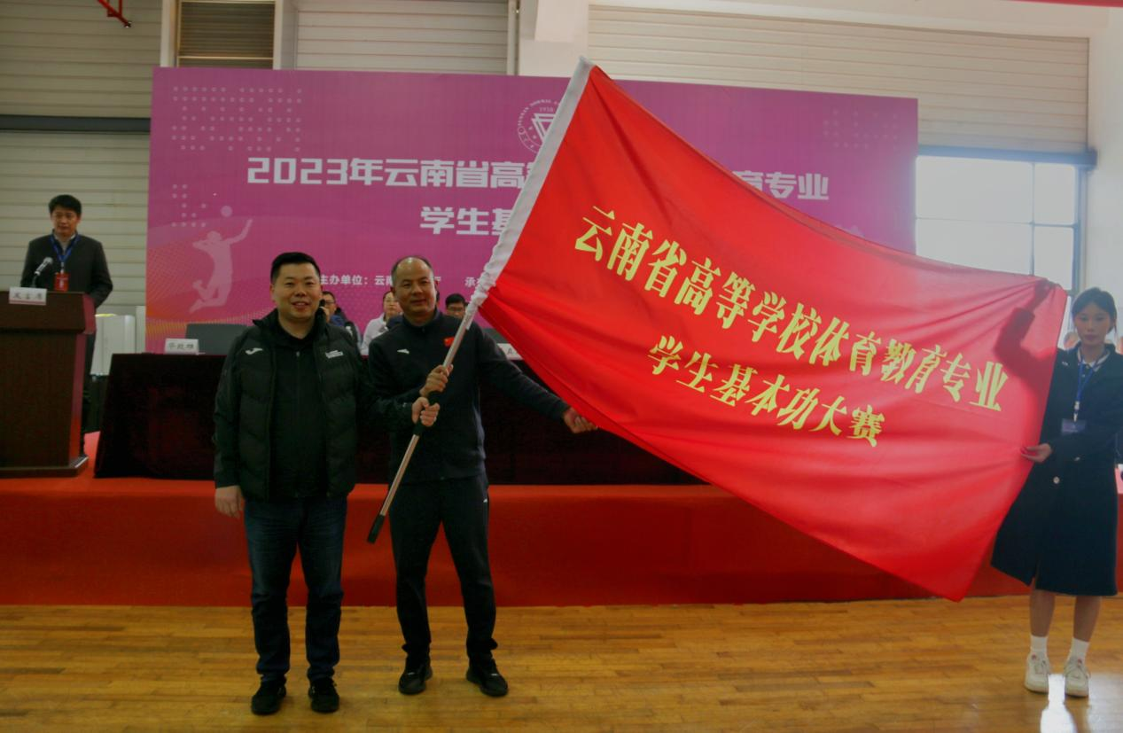 讲话结束后,他为云南师范大学授旗,体育学院党委书记华致雄代表学校接旗。