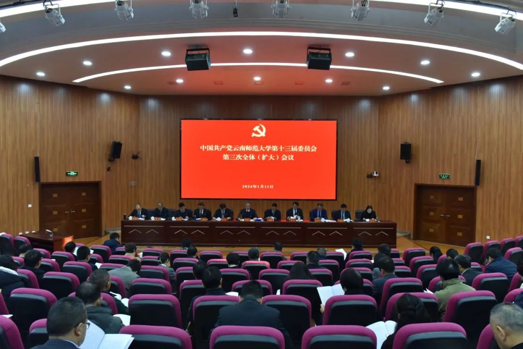 1月11日,中国共产党云南师范大学第十三届委员会第三次全体(扩大)会议在呈贡校区召开。校党委委员出席会议,非党委委员的校领导,校纪委委员,非党委委员的各职能部门主要负责人,非党委委员的各学院(学部)、附属中小学党政主要负责人,学校第十三次党员代表大会部分代表列席会议。