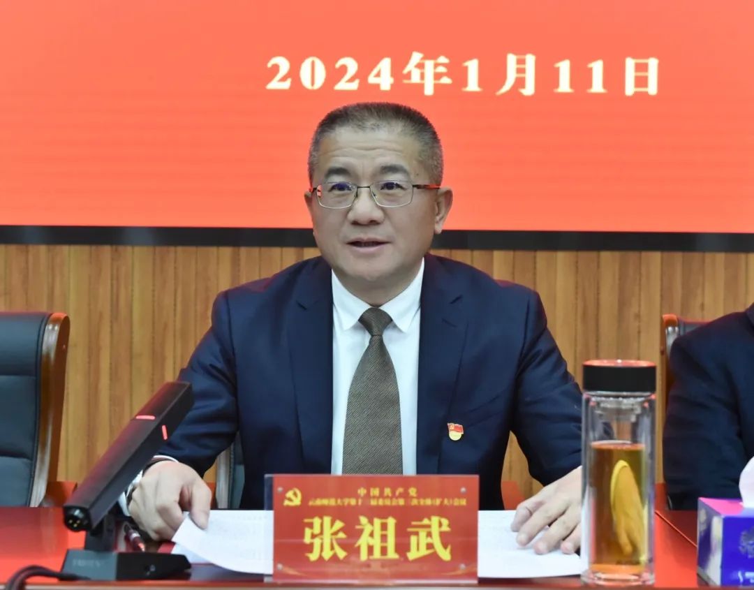 围绕学校2024年的工作,张祖武提出要求:一是持续巩固主题教育的成果。要持之以恒学深悟透习近平新时代中国特色社会主义思想,及时跟进学习贯彻习近平总书记最新重要讲话、重要指示精神,以思想理论水平的提高,促进政治能力、领导能力、落实能力的提升。要大兴调查研究之风,做到调研真情况、发现真问题,在真刀真枪真解决问题上见行动。要以实践为本,紧紧围绕学校中心工作、重点工作,立足于解决制约学校高质量发展的“卡脖子”问题,以“自我革命”精神持续深化巩固主题教育成果,真正把要事办成、难事办妥。二是切实增强巡视整改的自觉。对巡视整改中出现的问题,各级领导干部要带头抓整改、亲自盯落实,扎实做好巡视整改“后半篇文章”。要盯紧目标效果,以坚决有力的举措落实整改,以“钉钉子”的精神跟进整改,逐一对账销号,形成工作闭环,推进整改工作规范化、标准化、高效化。要着眼常态长效,正确处理当前与长远的关系,把整改经验提炼固化为推动全面从严治党的措施方法,真正实现标本兼治,将整改成效转化为学校高质量发展的动能。三是着力提高干事创业的能力。学校的高质量发展离不开高素质的干部队伍建设,关键看各级领导干部发现问题、分析问题、解决问题的能力。要“跳出师大看师大”,对标中央要求和新时代新要求新任务、先进地区好做法好经验,找准师大发展的差距和不足。转换角度,以旁观者的身份,从普通师生、学生家长的期望看领导干部的担当作为。要多一些思考,养成经常“回头看”的习惯,善于总结好的经验,善于找到问题症结,找准解决问题的突破口。要提高学懂政策、用好政策的能力,真正把政策变成思路、把思路变成方案、把方案变成项目。四是牢固树立狠抓落实的作风。各级领导干部作为“关键少数”,要敢管敢严、真管真严、长管长严,抓好班子带好队伍。要不折不扣、雷厉风行、求真务实、敢作善为抓落实,以对历史、对组织、对学校、对师生负责的态度,敢揽重任、勇挑重担,坚持冲在前、干在前,当表率、作示范,带领师生员工奋力打开工作新局面。五是坚决扛牢管党治党的责任。要坚持把党的政治建设摆在首位,旗帜鲜明讲政治。要增强组织力建设,从组织上加强党的建设。要持续推进“清廉学校”建设,始终保持严的基调、严的措施、严的氛围,层层压实责任、传导压力,一体推进“三不腐”,以全面从严治党新成效保障学校高质量发展。