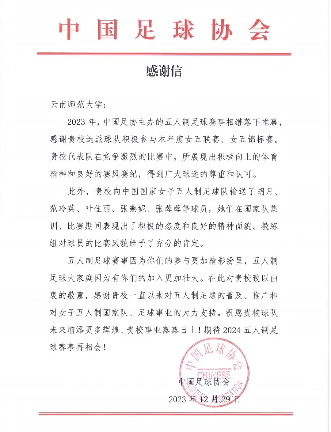 12月29日,中国足球协会向我校发来感谢信。来信中,感谢我校女子足球队在2023年积极参与女五联赛、女五锦标赛,充分肯定我校女足在竞争激烈的比赛中,所展现出积极向上的体育精神和良好的赛风赛纪,得到广大球迷的尊重和认可。感谢我校女子足球队向中国国家女子五人制足球队输送了胡月、范玲英、叶佳丽、张燕妮、张蓉蓉等球员,她们在国家队集训、比赛期间表现出了积极的态度和良好的精神面貌,教练组对球员的比赛风貌给予了充分的肯定。感谢我校一直以来对五人制足球的普及、推广和对女子五人制国家队、足球事业的大力支持。