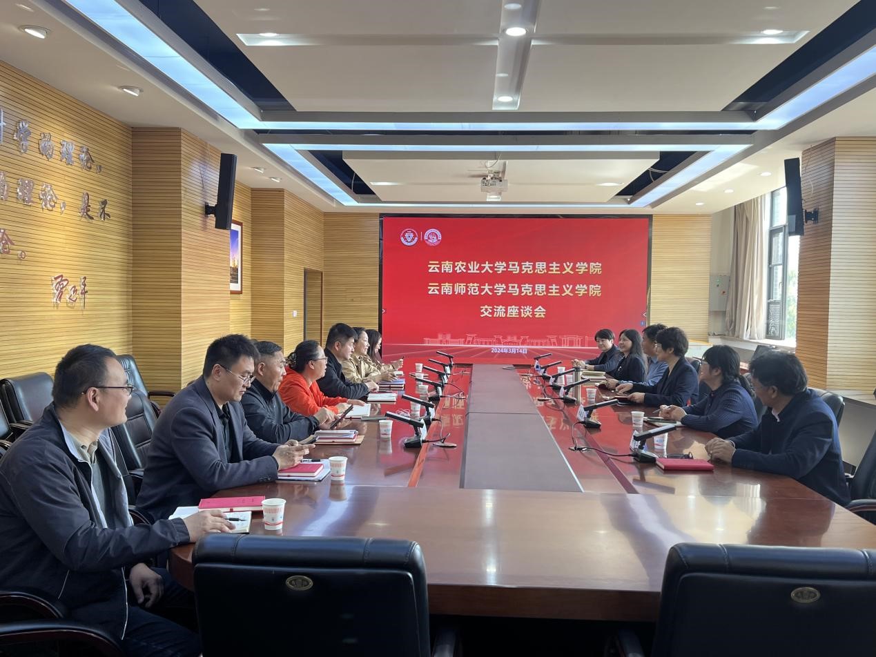 3月14日,在习近平总书记3·18重要讲话发表五周年之际,云南师范大学马克思主义学院班子成员与云南农业大学马克思主义学院书记、院长一行,就如何贯彻落实习近平总书记重要讲话精神,探索新时代高校思想政治教育的特点与规律、推进思想政治教育高质量发展,在云南师范大学举行交流座谈会。