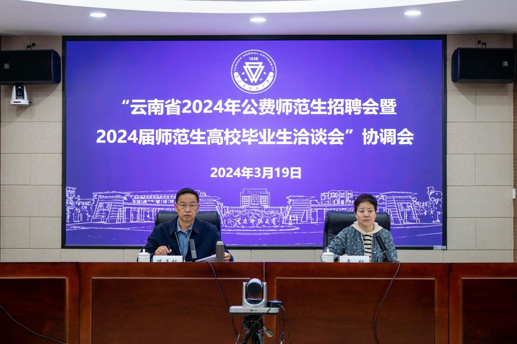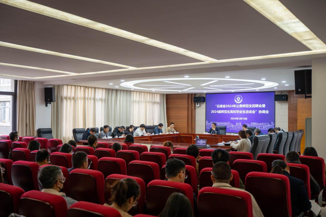 3月19日上午,我校在呈贡校区行政楼340会议室召开省公费师范生招聘会暨师范类高校毕业生双向选择洽谈协调会,副校长陈正权,相关职能部门负责人,各学院(学部)党委副书记、就业辅导员,就业处全体人员参加会议,会议由陈正权主持。
