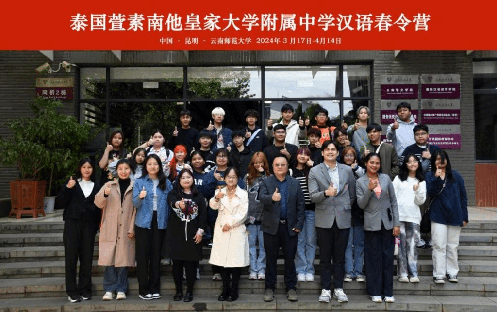 3月18日上午,泰国萱素南他皇家大学附属中学汉语春令营开营仪式在云南师范大学呈贡校区国际汉语教育学院举行。汉语国际推广师资培训基地(昆明)常务副主任沈毅,泰方领队教师张宏宾、鹿美晨,24名泰国高中学生参加了开营仪式。