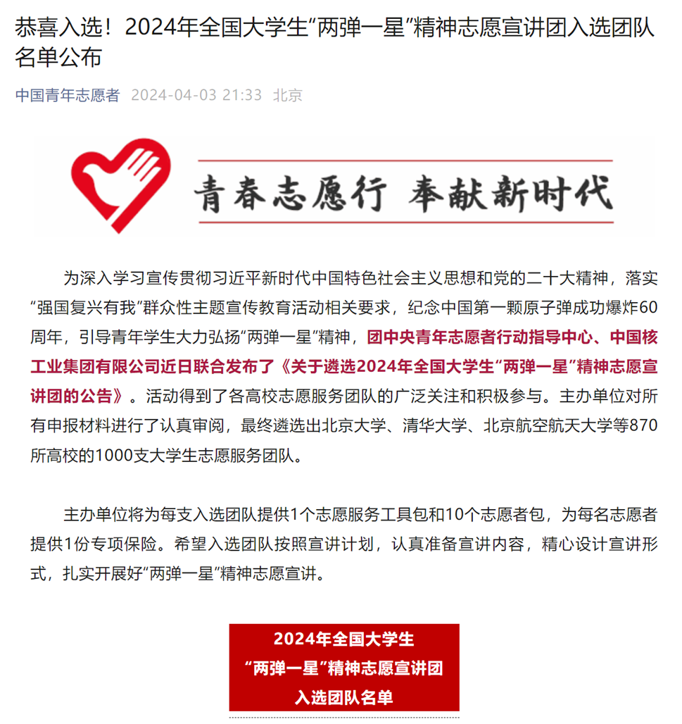 近日,我校教育学部“青声理论宣讲团”、马克思主义学院“星梦青语志愿宣讲团”分别入选2024年全国大学生延安精神志愿宣讲团、2024年全国大学生井冈山精神志愿宣讲团、2024年全国大学生“两弹一星”精神志愿宣讲团。