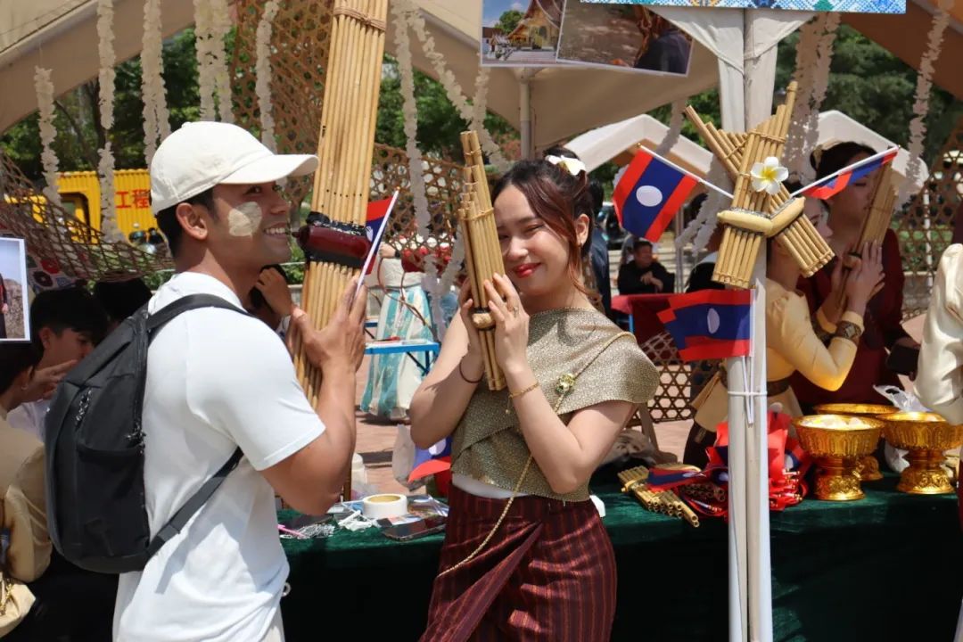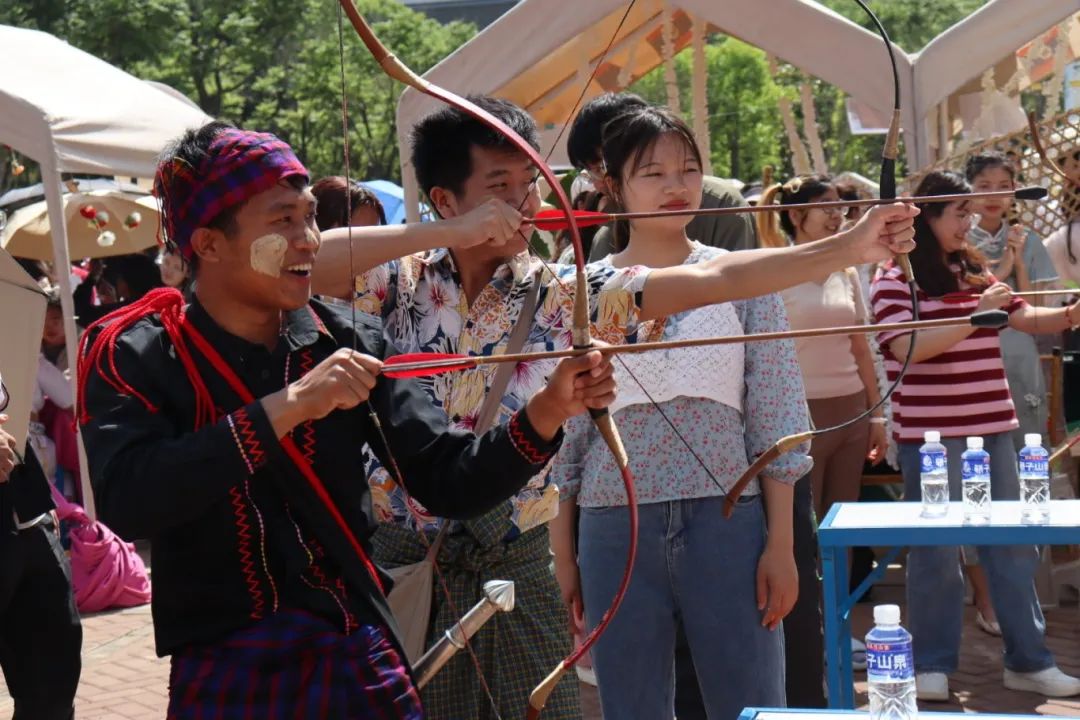 在中外民俗文化体验游园活动中,中式插花教学、手工团扇与香囊制作、书法展示、传统乐器演奏、汉服体验以及射艺让参与者目不暇接。留学生还设计组织了国别民俗文化体验活动,同学们开心学跳泰国舞;比拼拆开再重新组装俄罗斯套娃的速度;与印尼留学生一起游玩千年古典桌游“播棋”;向乌克兰留学生学习编制乌克兰花环。中外师生们兴致勃勃,沉浸式体验了各国民俗文化。