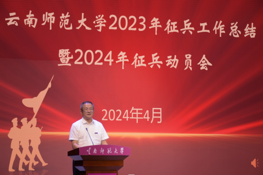 为进一步树牢大学生国防意识,鼓励广大青年学生积极响应国家征兵号召,高质量完成2024年度秋季征兵工作,4月25日下午,我校在呈贡主校区明德楼演播厅召开2023年征兵工作总结暨2024年征兵动员会。校党委书记张祖武、党委副书记李宏、副校长甘健侯,学校征兵工作领导小组成员单位主要负责人,各学院(学部)党委书记、副书记、辅导员,全体退伍复学学生及各学院(学部)有参军意愿的学生代表参加大会。