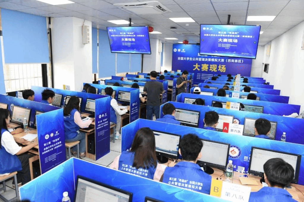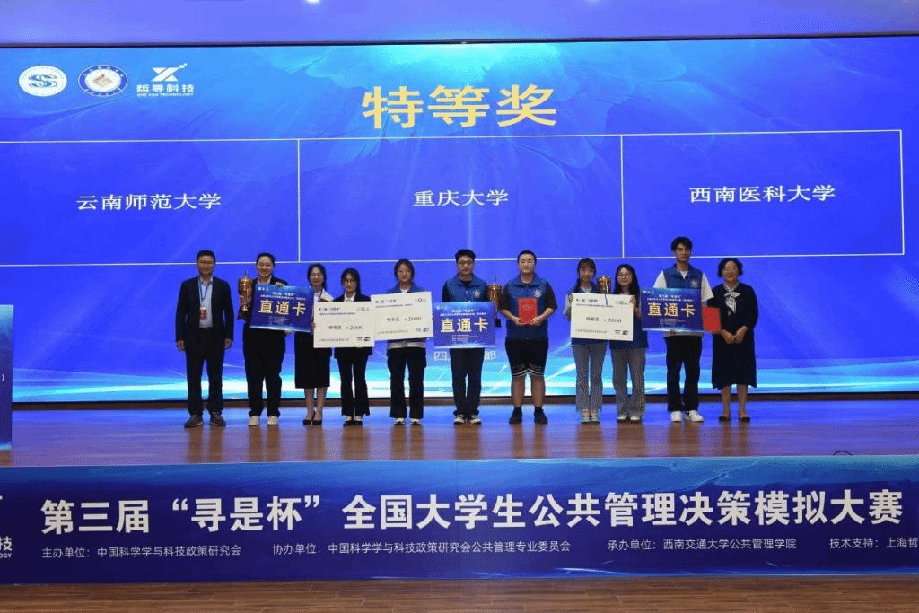 第三届大学生公共管理决策模拟大赛(西南赛区)由中国科学学与科技政策研究会主办、西南交通大学承办。西南赛区决赛共有来自四川、云南、重庆、贵州等地的44支高校队伍参赛,姜晓萍、李胜会、王欢明、梁丽芝、刘帮成等国内知名公共管理学者担任比赛评委。比赛由公共管理方案设计、公共管理决策演练沙盘对抗及现场团队答辩三部分构成,各占总分20%、50%和30%。我校“明德睿智先锋队”在方案设计、沙盘对抗环节表现优异,成功入围现场团队答辩环节,最终战胜诸多强劲对手,获大赛特等奖,成功晋级全国总决赛。