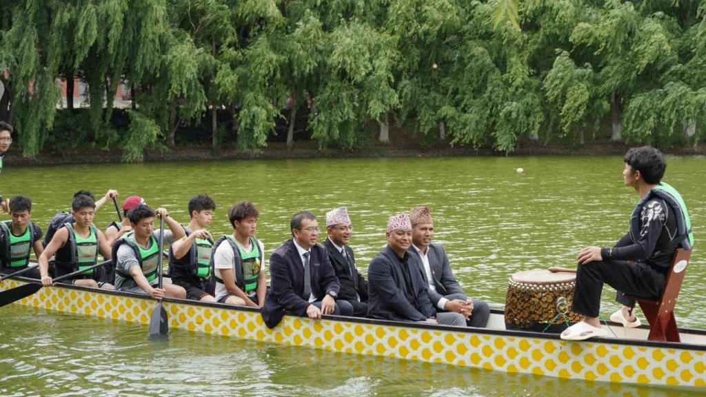 代表团参观了我校体育场馆,观看了学生的精彩表演。学校舞龙舞狮队、体育舞蹈队以及龙舟队的队员们,以他们的热情和技艺,展现了中华文化的魅力和我校学子的风采。在欢声笑语中,双方共同乘坐象征着友谊的龙舟,在水面上划出一道道和谐的波纹。