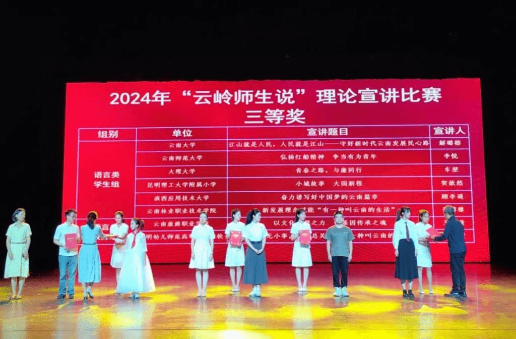 6月12日至13日,2024年“云岭师生说”理论宣讲比赛决赛暨观摩活动在云南艺术学院实验剧场举行。我校师生在比赛中表现优异,获一等奖1项,三等奖1项,云南师范大学获优秀组织奖。