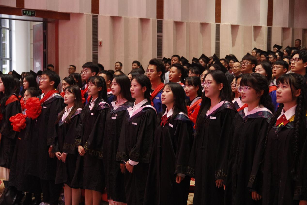 全体师生齐唱中华人民共和国国歌,毕业典礼在庄重热烈的气氛中拉开帷幕。校党委书记张祖武,党委副书记、校长胡金明,党委副书记李宏、降富楼,副校长甘建侯、陈正权,校纪委书记、监察专员孙剑,副校长徐锐出席典礼。陈正权主持典礼。