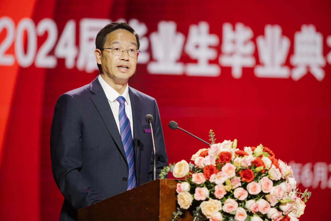 胡金明借用冰心先生赠友人葛洛的诗句“爱在右,同情在左,走在生命路的两旁,随时撒种,随时开花,将这一径长途,点缀得香花弥漫,使穿枝拂叶的行人,踏着荆棘,不觉得痛苦,有泪可落,也不是悲凉”送给毕业生作临别赠言,愿“爱”相伴一生。一是学会爱自己。无论什么情形下,都要爱自己,自爱者才能爱人,自爱是自我成长的永恒动力,也是播散爱的源泉。爱自己,才能刚毅坚卓、自强不息,迎接所有可能、挖掘所有潜能,让生命的价值饱满而丰盈。二是学会爱别人。“哪有什么岁月静好,不过是有人替你负重前行”。美好的岁月源于爱,不仅需要珍惜被人爱,更要学会爱别人。如果人生有主旋律,那一定是爱。三是学会爱国家。作为社会主义现代化国家建设的生力军,作为西南联大的传承人,要有一份坚定而浓烈的家国情怀。无论生活在哪儿,工作在什么岗位,只要胸怀祖国,踏实干事,就是对国家的爱。