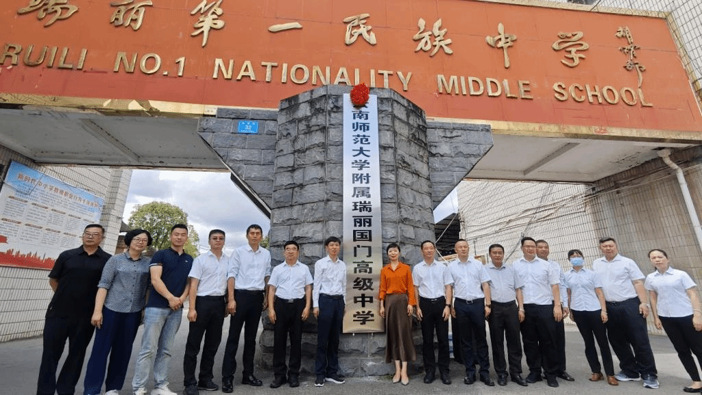 签约仪式后,胡金明一行前往瑞丽市,与德宏州委常委、瑞丽市委书记毛晓,德宏州副州长雪琳,瑞丽市市长温洋一同,为云南师范大学附属瑞丽国门小学、国门初级中学、国门高级中学揭牌。