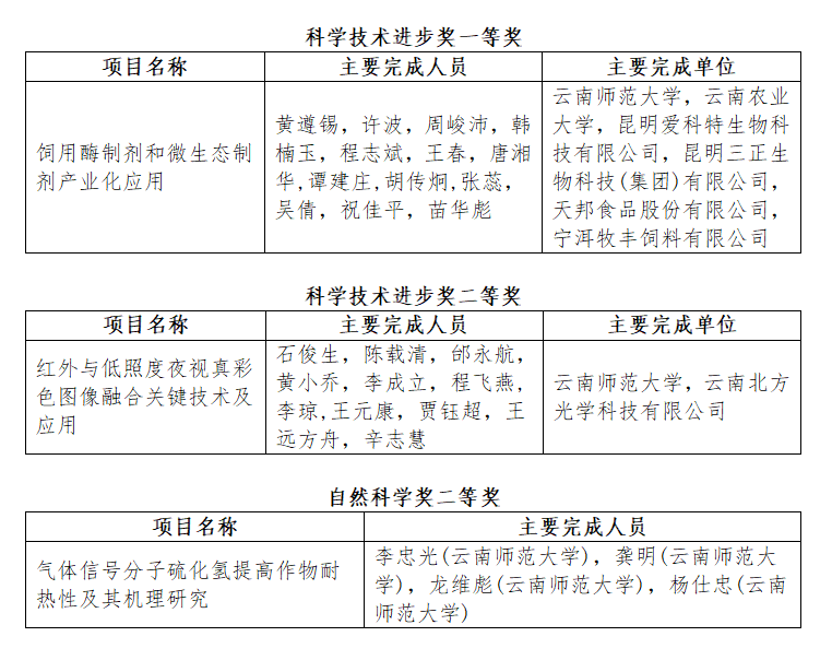 其中,以黄遵锡为第一完成人,云南师范大学为第一完成单位的成果“饲用酶制剂和微生态制剂产业化应用”获科学技术进步奖一等奖。项目团队历时近20年,在国家科技支撑计划、国家重大专项、国家自然科学基金等项目的支持下,整合省内外优势高校和企业协同创新,建立了云南典型植食性野生动物胃肠道及特殊生境中饲用酶基因和微生物资源库,创新饲用酶研发与应用技术体系,创制饲用抗生素替代新产品与应用技术体系,创建了饲料原料体外定向预处理技术体系及应用方案。成果促进了我国饲料工业和畜禽养殖业可持续高质量发展。