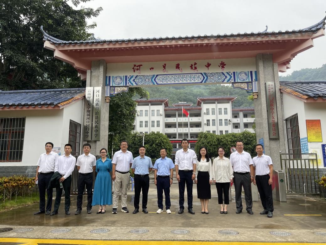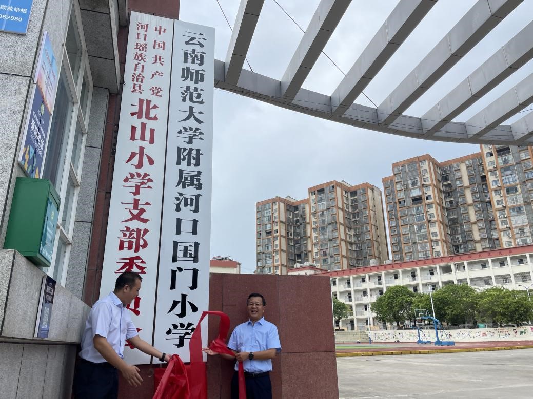 孟庆红一行到附属河口国门中学、附属河口国门小学走访调研,出席河口县对我校派驻国门学校校领导的任命会议。在附属河口国门小学北山校区调研时,孟庆红与河口县委副书记张恩崎为“云南师范大学附属河口国门小学”揭牌。