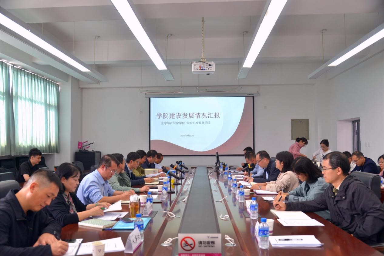 校长办公室、纪检监察处、教务处、研究生处、社科办、人事处负责人围绕学院人才引进、学位授权点申报、学科发展规划及纪检监察实体化办学等方面情况进行了研讨。