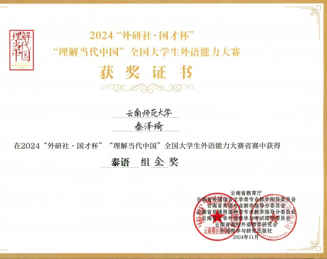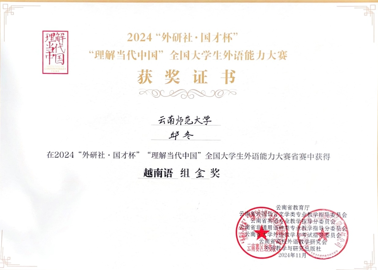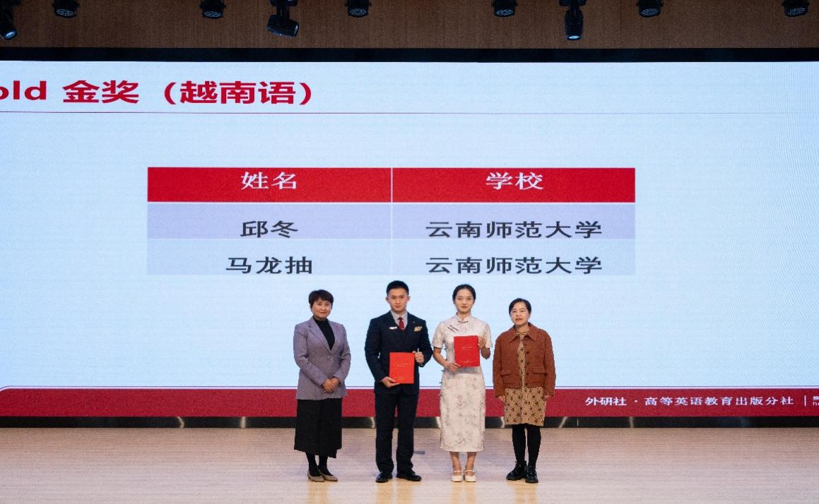 11月1日,“外研社·国才杯”“理解当代中国”全国大学生外语能力大赛云南省赛区决赛在西南林业大学落下帷幕。本次比赛由云南省教育厅和云南省外国语言文学类专业教学指导委员会共同主办,旨在推动高校外语教学改革,培育具有国际视野的外语人才,促进中国文化在国际舞台上的传播与理解。华文学院越南语、泰语专业学生在比赛中获得“三金一银”的好成绩。