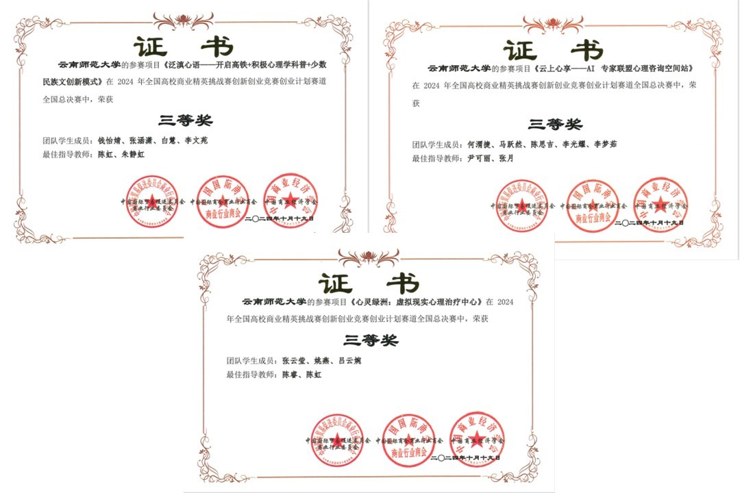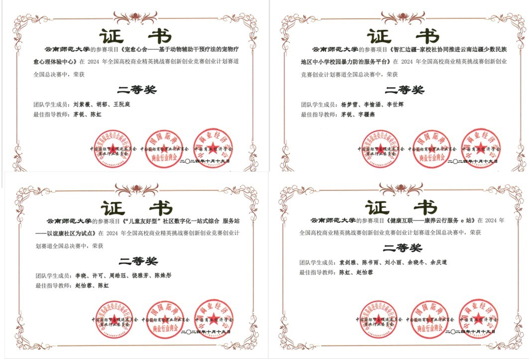近日,2024年全国高校商业精英挑战赛创新创业竞赛创业计划赛道全国总决赛落幕。共有来自全国各地的31个省、自治区、直辖市的500余所高等院校的3000余支参赛队报名参赛。由我校教育学部学子组成的7支代表队,在教师的悉心指导下,经过知识赛、校赛、区域赛和全国总决赛的层层选拔,最终在10月19日的创业计划赛道全国总决赛(线上)中取得了4项二等奖、3项三等奖的优异成绩。