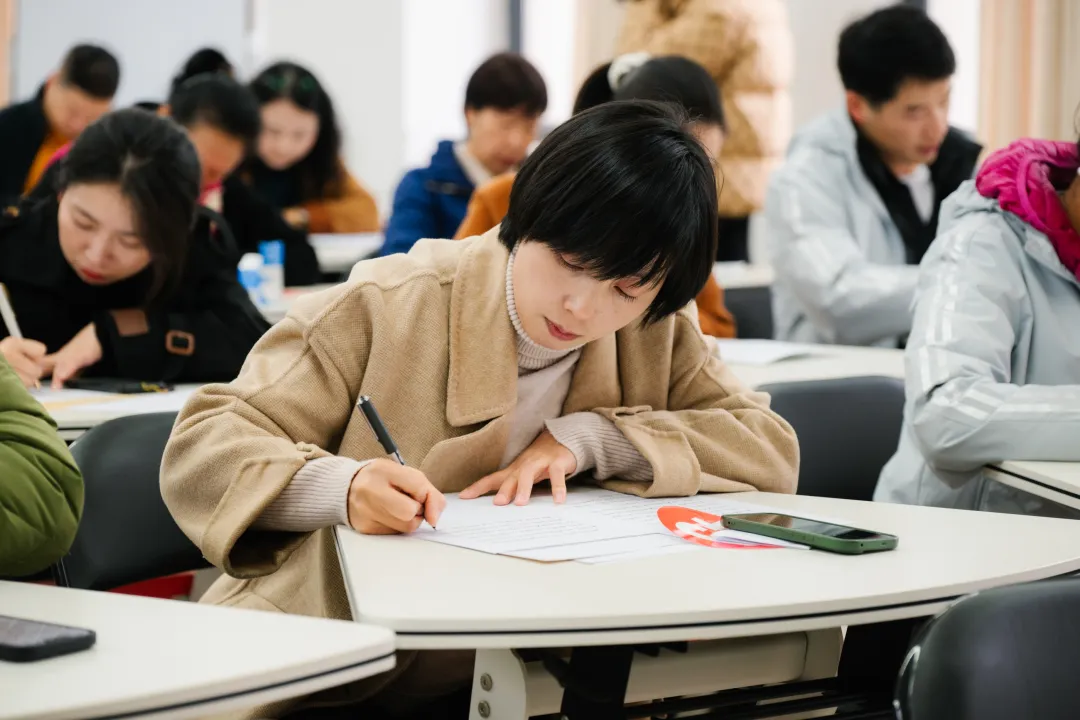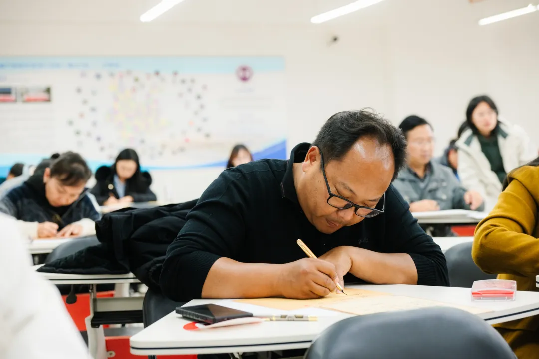 钢笔字比赛现场,大家全神贯注,书写刚劲有力,线条流畅自然,展现了选手扎实的硬笔书法功底。