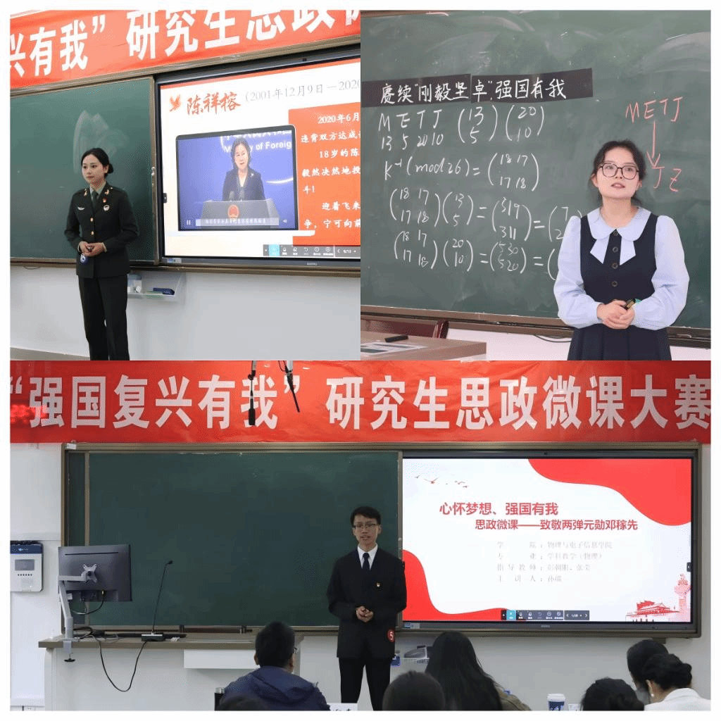 比赛精彩纷呈,展现了云师研究生们积极向上、昂扬奋进的精神状态。文学院退伍军人倪静通过“忆往昔峥嵘岁月”“看今朝不忘初心”“展未来砥砺前行”三个章节讲述了中国军人保家卫国的故事,展现了中国军人的忠诚与奉献;数学学院向青风团队讲述了数学家华罗庚在艰苦岁月中坚持数学研究和教学工作,凭借卓越的才华和不屈不挠的精神取得了举世瞩目的学术成就;物理与电子信息学院孙瑞同学讲述了“两弹元勋”邓稼先用一生回答的三个问题。