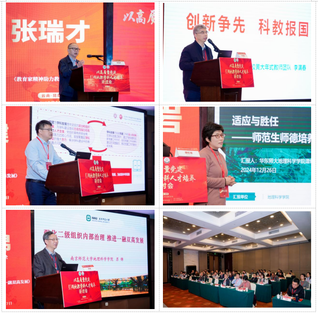 省人大常委会委员、省人大财政经济委副主任委员、中央马克思主义理论研究与建设工程重大项目首席专家张瑞才,南京大学 GIS与遥感研究所所长、地理与海洋科学学院原党委书记、国际欧亚科学院院士、国家教学名师、教育部长江学者特聘教授李满春,北京大学城市与环境学院党委书记彭建,华东师范大学地理科学学院党委书记谭红岩,南京师范大学地理科学学院党委书记苏锦分别以《教育家精神助力教育强国建设》《创新争先,科教报国》《高质量党建引领一流学科发展》《适应与胜任,师范生师德培养的思考与实践》《强化二级组织内部治理推进一融双高发展》为题作主旨报告。