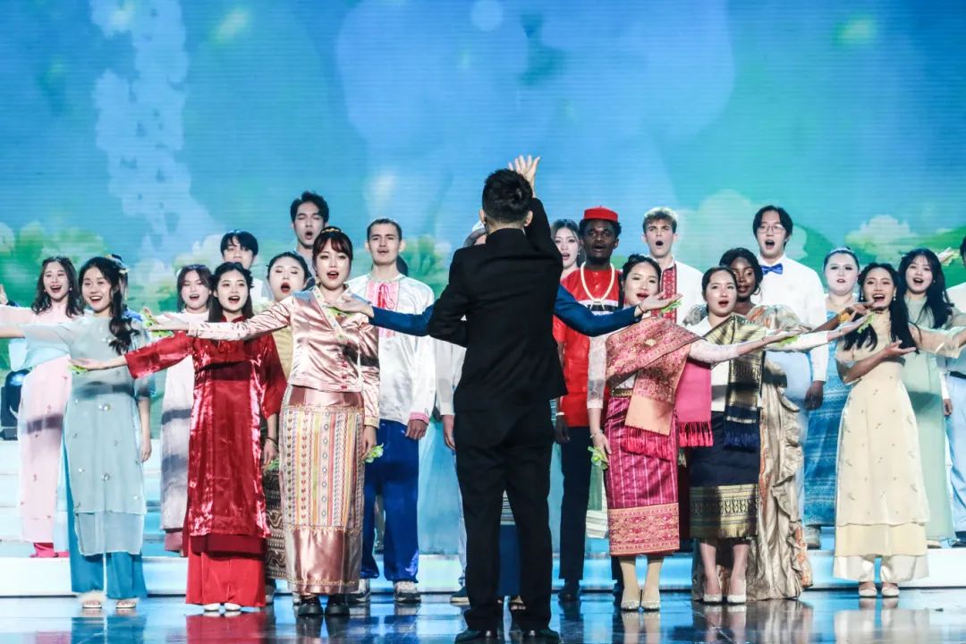 《“一带一路”·歌舞相和》舞蹈表演,讲述了来自泰国、乌克兰、越南、缅甸等国家的36名留学生的故事。来自不同国家的学生们相聚云师,带着各自的智慧与热情,成为中外文化交流的使者。
